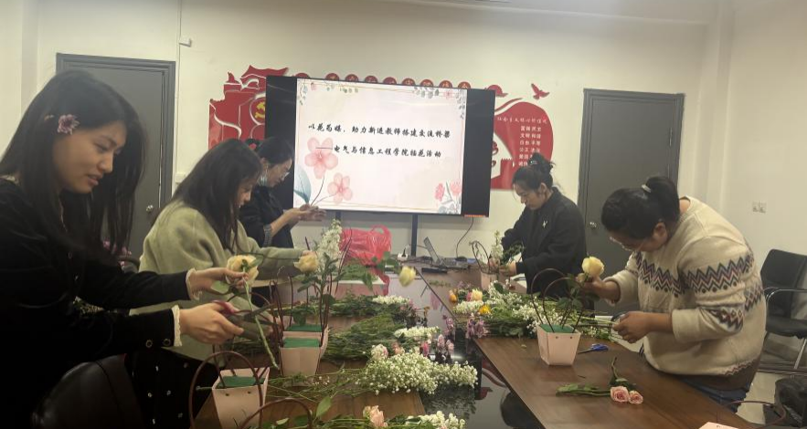 为增进新进教师之间的了解与互动,营造温馨和谐的学院氛围,电气与信息工程学院于2025年2月28日下午在励行楼B415会议室举办了一场富有创意的插花艺术活动。此次活动以“以花为媒,助力新进教师搭建交流桥梁”为主题,旨在通过轻松愉快的艺术形式,促进新进教师之间的沟通与合作,进一步增强团队凝聚力。