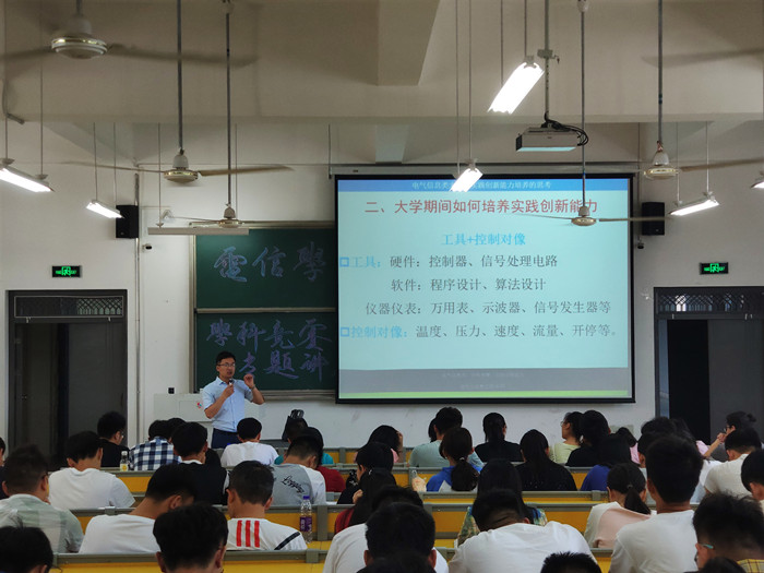 会上,曹珍贯以《电气信息类大学生实践创新能力培养的思考》为题,阐明了学科竞赛对于学生实践能力提升和自主学习、自主创新意识培养的意义。结合学院开展的全国大学生电子设计大赛、全国大学生“飞思卡尔”智能车大赛、全国大学生工业自动化挑战赛等竞赛,向同学们详细介绍了竞赛的基本概况、能力要求、赛前培训和实践制作等方面的情况。他告诉同学们,要扎实学习好每一门专业课,打下坚实的专业基础,多思考,多动手,在实践中融会贯通。