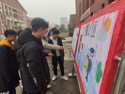 开展一次交通安全展板宣传活动。学院积极营造“安全靠着你我他,和谐交通靠大家”的道路交通安全人人参与的良好氛围,12月2日,两块手绘交通安全宣传展板在学院楼西侧展出,吸引了大量的过往师生驻足观看,提醒广大师生注意交通安全,让广大进一步认识了“知危险会避险,安全文明出行”的重要性,自己养成遵守交通法规的良好习惯,保障人身安全。