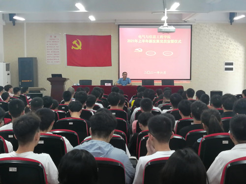 仪式后,徐关怀代表学院党委对158名新鲜血液加入党的队伍表示热烈欢迎和祝贺,带领大家共同学习了习近平总书记在“七一勋章”颁授仪式上的重要讲话。他说,在全国全党上下共同迎接中国共产党百年华诞这一特殊时刻举行2021年上新发展党员集体入党宣誓具有十分重要的纪念意义。希望新党员同志们要严格以党章为根本遵循,牢记初心使命,不断锤炼党性,不仅在组织上入党,更要在思想上入党;要坚持以习近平新时代中国特色社会主义思想为指导,自觉加强理论学习和业务学习,不断提高理论修养和专业素养,立志成长为德才兼备的可用之才;要始终牢记党员身份,积极投身中华民族伟大复兴的伟大实践,在全面建设社会主义现代化国家新征程中找准位置,奋力拼搏,砥砺前行,以优异的成绩为党旗增光添彩,为学校学院的发展贡献力量。