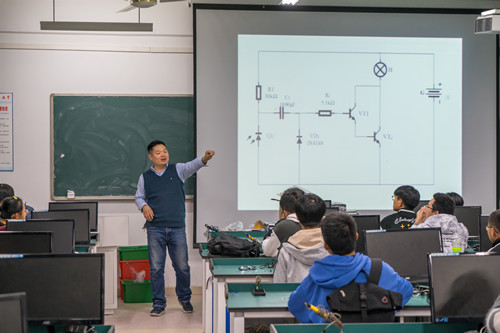 围绕光控延时电路设计内容,徐善永老师设计了一堂既有趣味导向性,又具有专业特色的实训课。首先,他介绍了学院品牌学科竞赛和近年学生获奖情况,增进同学对学院电子设计等科创品牌竞赛的认识;随后,结合具体课程案例深入浅出地讲解光控延时电路的相关知识,普及和加深同学们对专业知识了解;操作环节,他指导学生现场焊接光控延时电路,并对电路板功能进行检测演示等。