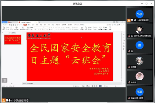 开展一次主题班会4月11日至14日,电信学院各团支部积极召开了全民国家安全教育日主题“云班会”。云班会上,各团支部学生深入学习以习近平同志为核心的党中央关于总体国家安全观、国家安全工作的重大部署和要求,以及《国家安全法》《反间谍法》等国家安全法律和重要政策文件,探讨作为当代大学生,如何践行总体国家安全观,自觉履行维护国家安全的义务。