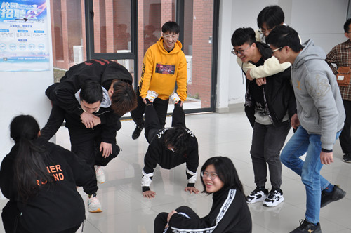 活动伊始,酒亚文介绍了此次素质拓展活动的目的及注意事项。随后报数分组选出小组组长,组长带领同学设计队旗、口号,各队依次齐声喊出口号,将素质拓展活动带入高潮。此次活动包括“七手八脚”“食指神功”等内容。“七手八脚”活动中,各队成员充分交流,协作得当,在活动现场摆起各种POSE;“食指神功”活动中,两两队员团结互助,配合默契,充分发挥团队协作精神。活动最后,通过“实践+感想”的方式让学生交流参加活动的心得体会,进行最后的总结。