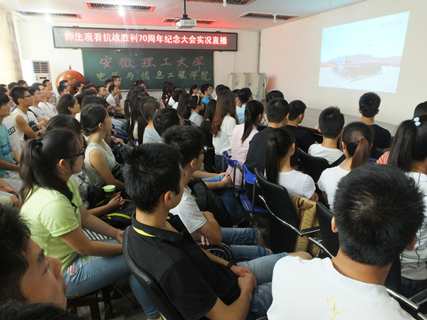 直播结束后,师生们仍迟迟不愿离去,他们还在热烈的讨论着阅兵式中的精彩场景,分享着自己的心得和感悟,12级电气专业徐孝萍同学在QQ说说中深情写到:看大阅兵,热血沸腾,身为中国人而感到骄傲,革命先烈的奋战和牺牲才有我们今天这样的生活,祖国伟大,人民伟大,祖国会越来越强大!13级自动化周瑞吉同学更是激动的说,“阅兵式是一个国家实力的最好展现,阅兵式上那么多先进的装备都是国产的,这令我非常自豪!为中国创造加油”。