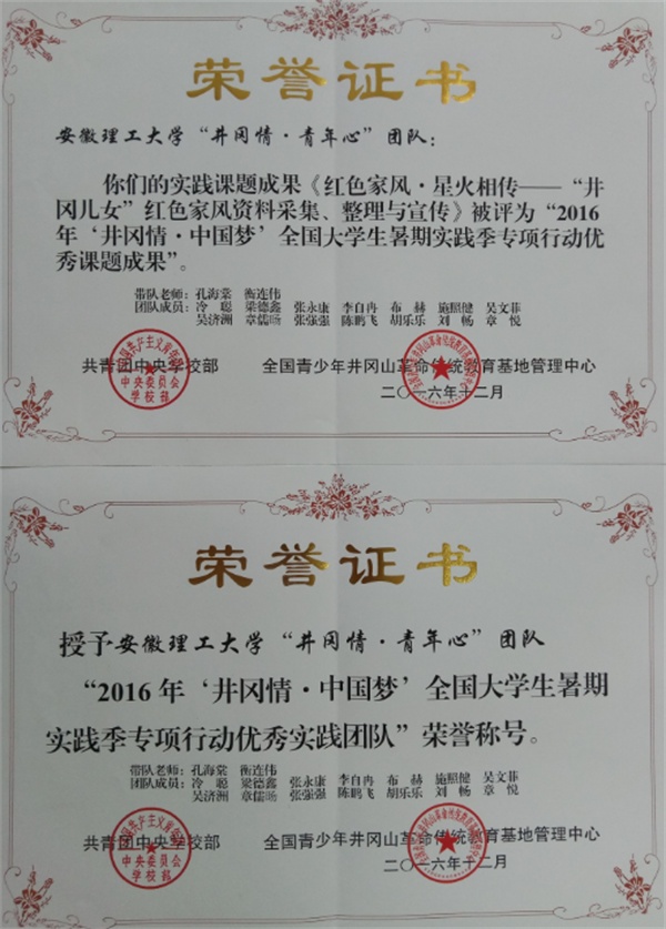 我院孔海棠、衡连伟老师指导的“井冈情•青年心”团队与复旦大学、同济大学、南京大学等90支高校实践团队,被授予“2016年‘井冈情•中国梦’全国大学生暑期实践季专项行动优秀实践团队”荣誉称号。我校“井冈情•青年心”团队的课题成果《红色家风•星火相传——“井冈儿女”红色家风资料采集、整理与宣传》与南开大学、南京航空航天大学等全国50所高校实践团队的课题成果,被评为“2016年‘井冈情•中国梦’全国大学生暑期实践季专项行动优秀课题成果”。
