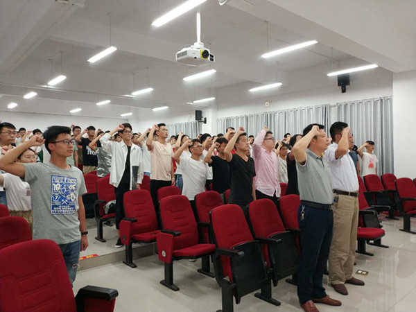 在领誓人带领下,全体新发展的党员面向党旗,紧握右拳庄严宣誓,表达忠诚于党,为共产主义事业奋斗终身的决心。
