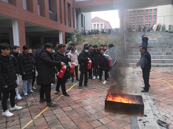 培训会结束后,在彭广峰和陈伟两位老师的指导下,老师和同学们演练了遇火灾的逃生方法,在室外开展了现场使用灭火器灭火的演练。