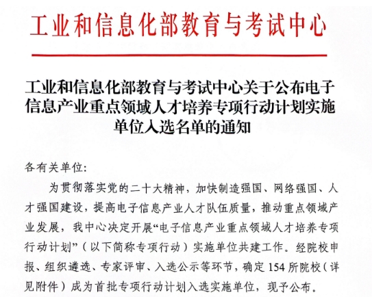 近日,工业和信息化部教育与考试中心发布了《工业和信息化部教育与考试中心关于公布电子信息产业重点领域人才培养专项行动计划实施单位入选名单的通知》,我校成功入选首批建设的产教融合示范基地实施单位。
