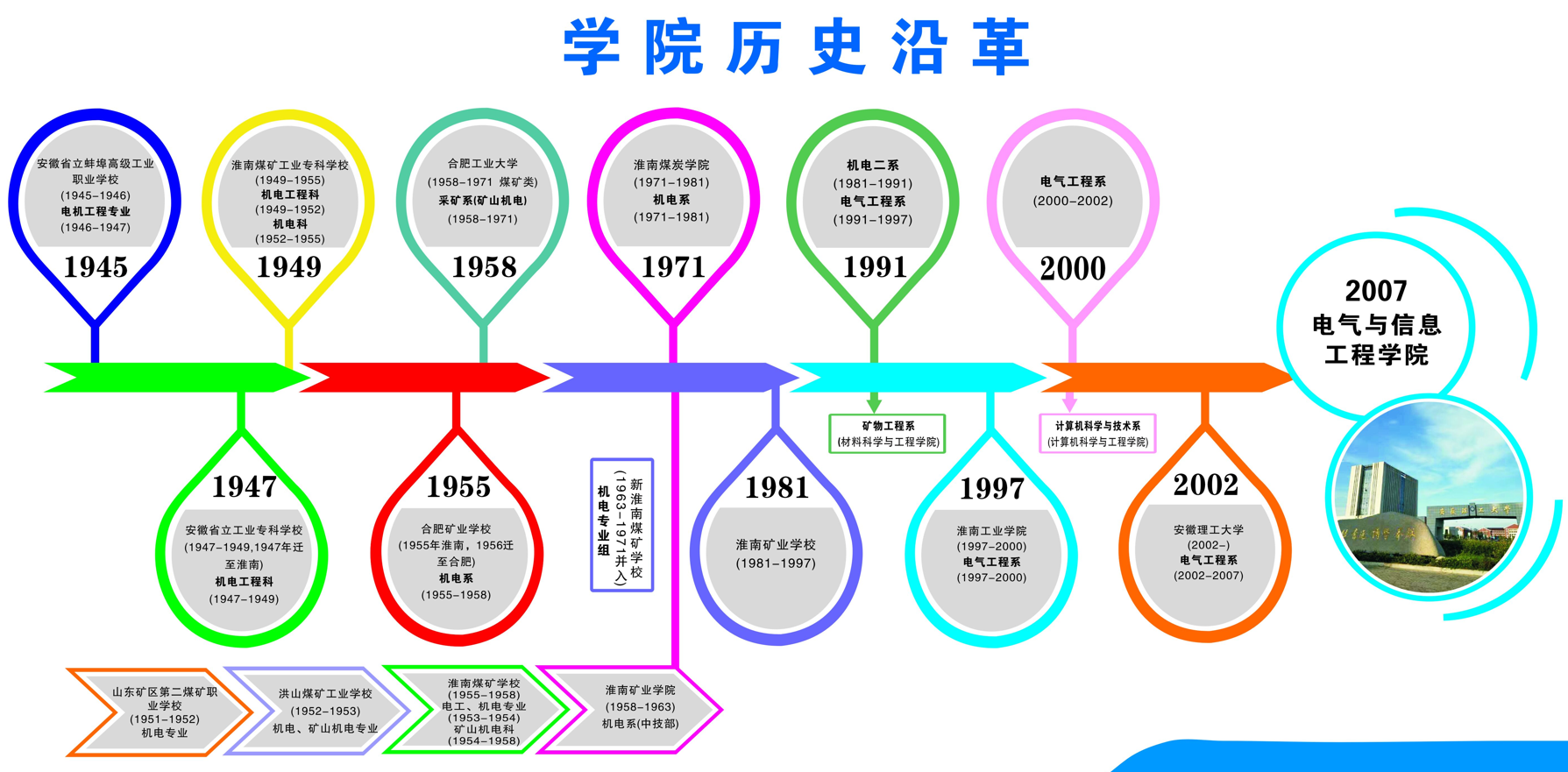 色情卡通 源于1972年成立的淮南煤炭学院的机电系,办学历史可追溯至1945年成立的省立蚌埠高级工业职业学校的电机工程专业(1955年学校由淮南煤矿工业专科学校升格为合肥矿业学院,1958年更名为合肥工业大学,1971年与煤矿有关的学科专业等整建制迁回淮南,与淮南煤矿学校合并组建淮南煤炭学院,到2002年学校更名为色情卡通 )。1981年从机电系分离出来成为机电二系,到1991年更名为淮南矿业学院电气工程系,同时把选矿专业分离出去成立了材料工程系(材料科学与工程学院),2000年把计算机科学与技术专业分离出去,成立了计算机科学工程系(计算机科学与工程学院),2007年8月更名为色情卡通 。